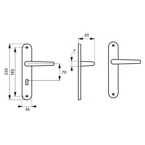 Plaques acier embouti. Béquilles aluminium fondu. carré acier 7 mm. Vis métaux sécables. Entr’axe de fixation 195 mm.