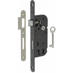 Coffre acier embouti. TĂŞtière acier. Demi-tour alliage rĂ©versible sans dĂ©montage du coffre. PĂŞne acier. Gâche plate acier. MĂ©canisme Ă 1 tour. CarrĂ© 7 mm, entr’axe 70 mm. 1 clĂ© – 6 variures.