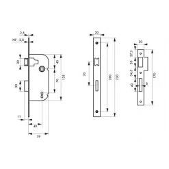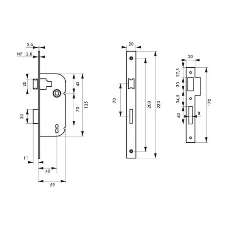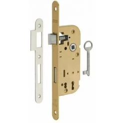 Coffre acier embouti. Têtière acier. Demi-tour alliage réversible sans démontage du coffre. Pêne acier. Gâche plate acier. Mécanisme à 1 ou 2 tours (avec 2 clés). Carré 7 mm, entr’axe 70 mm. 1 clé. 6 variures.