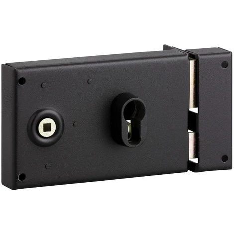 Coffre et gâche acier cambré, pêne acier, demi-tour acier, mécanisme à 2 tours carré 6 mm finition époxy noir granité