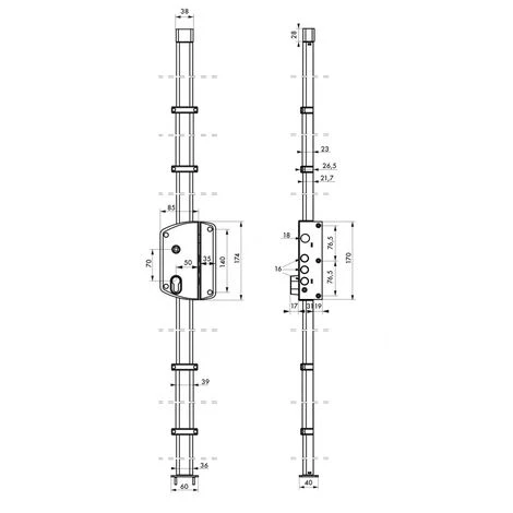 Boîtier peint époxy en acier embouti, têtière cambrée ép. 20/10ème. Coffre de 85 x 174 mm, axe à 50 mm, entraxe 70 mm. Tringles standard permettant une condamnation de porte de 1,95 m à 2,20 m. Mécanisme permettant la manœuvre du 1/2 tour avec la clé, de l’intérieur comme de l’extérieur. 3 pênes dormant Ø 16 mm et 1 pêne 1/2 tour Ø 18 mm en acier nickelé. Pênes haut et bas en acier nickelé Ø 14 mm sur tringles télescopiques en acier permettant un ajustement très précis à la longueur désirée. Gâche basse en acier zingué ép. 3 mm. Carré 7mm. Béquille double fournie. Installation des tringles et cache-tringles, sans recoupe.