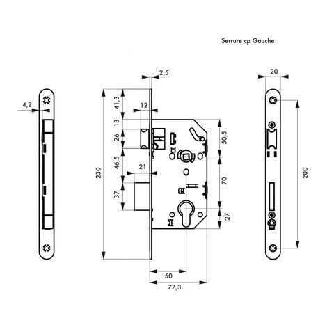 Coffre acier embouti. TĂŞtière acier bouts ronds. Demi-tour bipente alliage. PĂŞne acier galvanisĂ©. Gâche acier zinguĂ©. MĂ©canisme Ă 2 tours. Rappel du 1/2 tour par la clĂ©. CarrĂ© 7mm, entr’axe 70 mm.- Dimension : 77.5×147.5mm