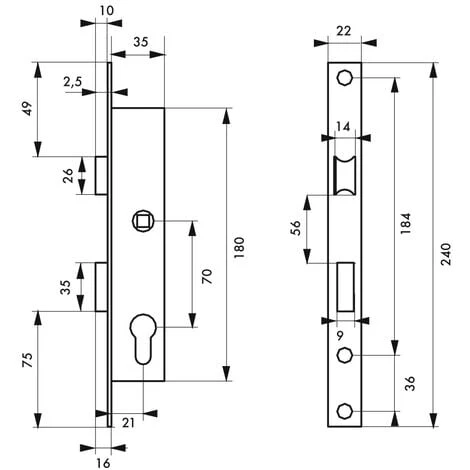 Coffre acier. TĂŞtière inox. Demi-tour rĂ©versible sans dĂ©montage du coffre. Rappel du 1/2 tour par la clĂ©. PĂŞne alliage nickelĂ©. Gâche plate inox. CarrĂ© 8 mm avec fourreau rĂ©ducteur 7 mm. Entr’axe 70 mm.