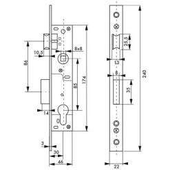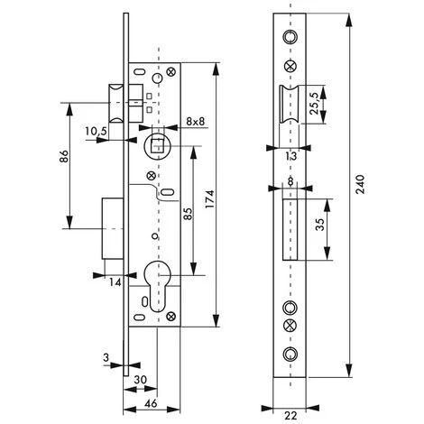 Coffre acier. TĂŞtière inox. Demi-tour rĂ©versible sans dĂ©montage du coffre. Rappel du 1/2 tour par la clĂ©. PĂŞne alliage nickelĂ©. Gâche inox. CarrĂ© 8 mm, entr’axe 85 mm.