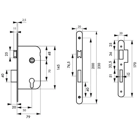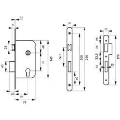 Coffre acier embouti. TĂŞtière acier, laiton ou inox. Demi-tour alliage zinguĂ© rĂ©versible sans dĂ©montage du coffre. PĂŞne alliage zinguĂ© ou laiton. Gâche plate acier. MĂ©canisme Ă 2 tours. Rappel du 1/2 tour par la clĂ©. CarrĂ© 7mm, entr’axe 70 mm.- Dimension : 79x145mm