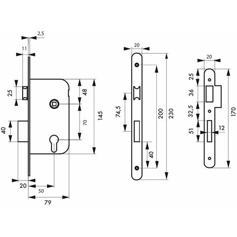 Coffre acier embouti. TĂŞtière acier, laiton ou inox. Demi-tour alliage zinguĂ© rĂ©versible sans dĂ©montage du coffre. PĂŞne alliage zinguĂ© ou laiton. Gâche plate acier. MĂ©canisme Ă 2 tours. Rappel du 1/2 tour par la clĂ©. CarrĂ© 7mm, entr’axe 70 mm.- Dimension : 79x145mm
