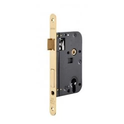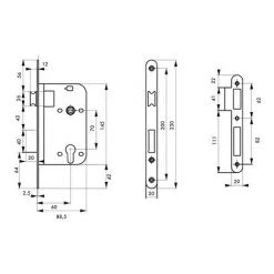 Coffre acier embouti. TĂŞtière laiton. 1/2 tour laiton rĂ©versible sans dĂ©montage du coffre. PĂŞne laiton. Rappel du 1/2 tour par la clĂ©. CarrĂ© 7mm, entr’axe 70 mm. Gâche plate selon finition.- Dimension : 88.5x145mm