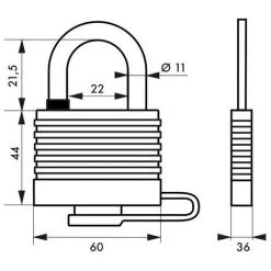 Corps à lamelles acier zingué gainé PVC. Anse acier cémenté gainée PVC. Double verrouillage par billes inox. Mécanisme à goupilles. 2 clés laiton nickelé gainé PVC.
