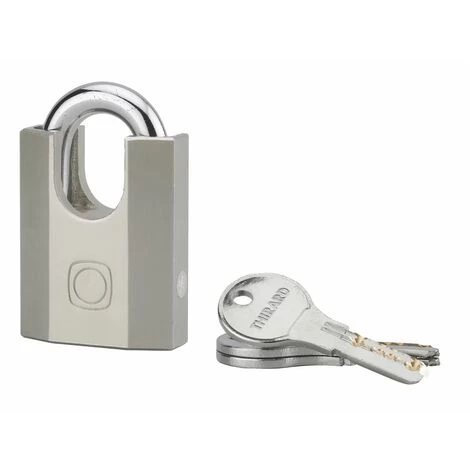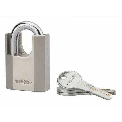 Corps acier. Anse acier cĂ©mentĂ© nickelĂ©. MĂ©canisme Ă goupilles. Double verrouillage par billes. Trou d’Ă©coulement d’eau. 3 clĂ©s rĂ©versibles.