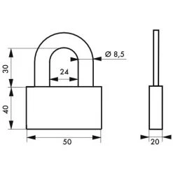Corps acier nickelé satin. Anse acier cémenté nickelé. Mécanisme à goupilles. Double verrouillage par billes. Rotor laiton. 4 clés réversibles.- Dimension : 50 mm