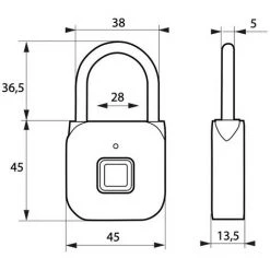 Corps alliage. Anse acier nickelĂ©. Ouverture par empreinte digitale. Rechargeable par Câble Usb, charge complète en 30min. DC 3.7V – 100mAh – batterie lithium. Indicateur de batterie faible. Fonctionnement -20°C/+60°C. PossibilitĂ© d’enregistrer jusqu’Ă 39 empreintes.