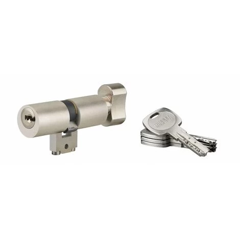 Mécanisme à 8 goupilles (7 en maillechort et 1ère en acier trempé). Protection contre le perçage par 1ère goupille + poussoir en acier trempé Protection contre la casse par poutre en acier. 4 clés plates réversibles en laiton nickelé avec carte de propriété.