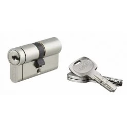 Profil europĂ©en laiton. MĂ©canisme Ă 7 Ă 16 goupilles.Protection contre l’effraction de la partie saillante ducylindre (anti-snap). Panneton anti arrachement. 3 clĂ©splates rĂ©versibles laiton nickelĂ© avec carte de propriĂ©tĂ©.Option : Protection contre le perçage par aiguille + 1ère goupille + poussoir en acier trempĂ©.