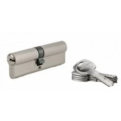 Profil européen laiton. Mécanisme à 6 goupilles. Protection contre le perçage par aiguille en acier trempé. Panneton anti arrachement. 5 clés plates réversibles acier nickelé.