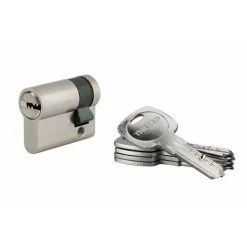 Profil européen laiton. Mécanisme à 6 goupilles. Protection contre le perçage par aiguille en acier trempé. Panneton anti arrachement. 5 clés plates réversibles acier nickelé.