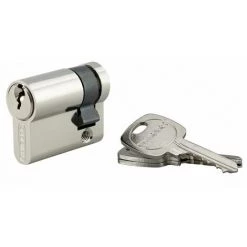 Profil europĂ©en laiton. MĂ©canisme Ă 5 goupilles. Panneton anti arrachement. 3 clĂ©s en laiton nickelĂ©.- Dimension : 30×10 mm