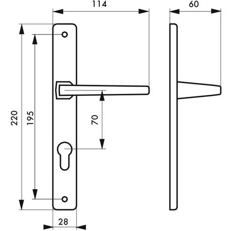 Plaques Ă©troites aluminium embouti. BĂ©quilles aluminium fondu. carrĂ© acier 7 mm. Vis mĂ©taux Ă douille. Pour porte Ă©p. 45 mm maxi. Entr’axe de fixation 195 mm.