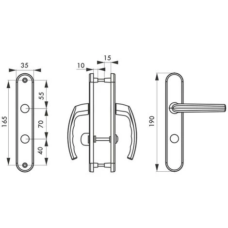Entraxe de fixation 195mm. Sans trou pour porte intérieure. Avec bouton de condamnation pour porte de salle de bains et W-C. Avec trou de clé pour porte intérieure. Avec trou de cylindre européen pour porte extérieure. Avec trou de cylindre européen pour porte palière.