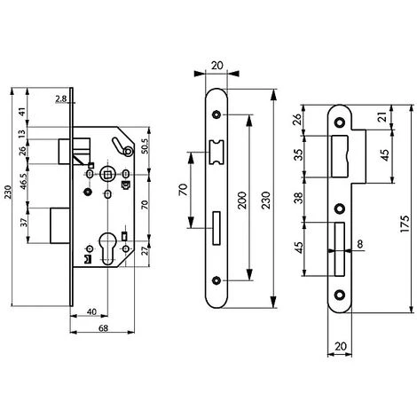 Serrure à larder à cylindre européen axe à 40 mm, réversible, Réversible
