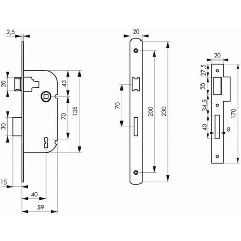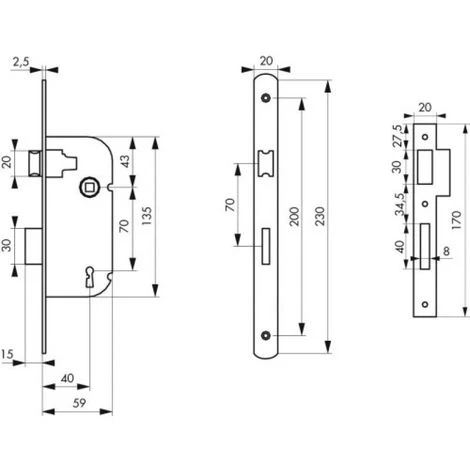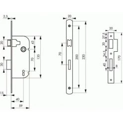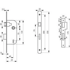 Serrures de sûreté à larder à gorgesSerrure à larder monopoint à 3 gorges axe 40 mm Réversible. Mécanisme à 3 gorges. Coffre en acier embouti : 135 mm x 59 mm. Têtière bouts ronds : 230 mm x 20 mm. Axe 40 mm. Entraxe 70 mm. Fouillot carré : 7 mm. Gâ