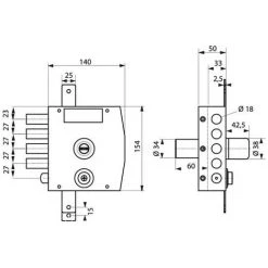 Coffre et gâche acier. Fermeture à 2 tours. Rappel du 1/2 tour par la clé. Pênes diam. 18mm. Protection du cylindre par cabochon acier. 5 clés.