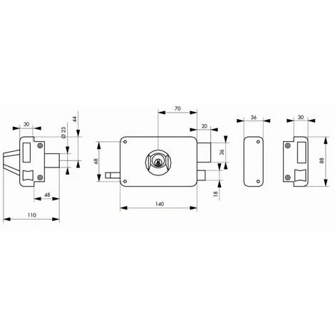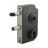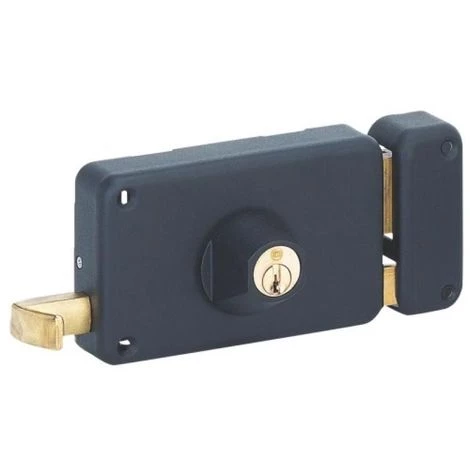 Coffre et gâche en acier embouti époxy granité noir. Pêne dormant et demi-tour en acier zingué bichromaté. Demi-tour avec équerre. Mécanisme à deux tours. Cylindre laiton 5 goupilles Ø 23 x 45 mm.