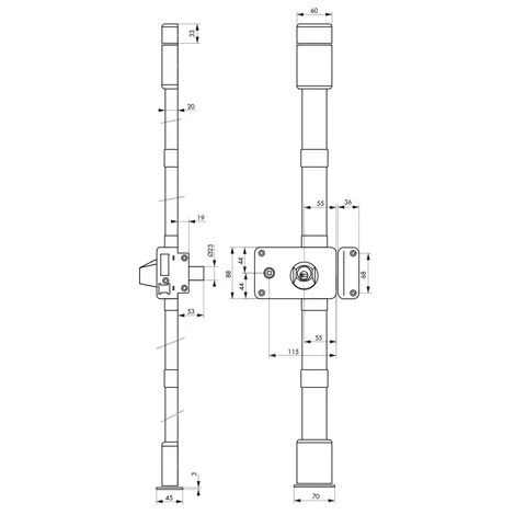 Boîtier en acier embouti ép. 20/10ème. Coffre de 140 x 88 mm. Tringles standard permettant une condamnation de porte de 1,65 m à 2,25 m. Mécanisme intérieur type équerre permettant la manœuvre du 1/2 tour avec la clé, de l’intérieur comme de l’extérieur. Pêne dormant et 1/2 tour en laiton massif. Pêne haut et bas en acier Ø 16 mm sur tringles plates en acier permettant un ajustement très précis à la longueur désirée et ne nécessitant aucune recoupe. Gâche avec têtière de haute résistance. Cache-tringles, guides et gâches de pênes haut et bas en acier ne laissant apparaître aucune vis de fixation. Enjoliveur de cylindre côté intérieur. Carré 6 mm. Le montage des serrures ne nécessite pas d’entaillage spécifique de la porte.