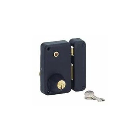 Mécanisme à 2 tours. Fouillot : 7 mm Cylindre : diamêtre 23 x 45 mm Finition : époxy noir Dimension : 75 x 130 mm Livrée avec gâche acier et 3 clés nickelées.