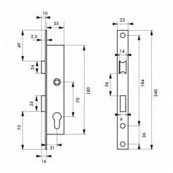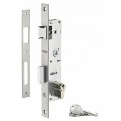 Serrure pour porte menuiserie métallique. Coffre acier. Têtière inox. Demi-tour réversible sans démontage du coffre. Rappel du 1/2 tour par la clé. Pêne alliage nickelé. Gâche plate inox. Carré 8 mm avec fourreau réducteur 7 mm. Entraxe 70 mm. Zingué. Livré avec cylindre profilé laiton nickelé 30 x 30 mm et 3 clés.