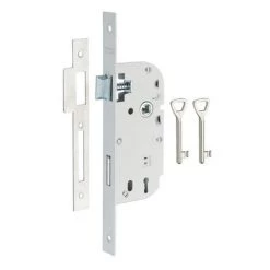 Coffre acier embouti. TĂŞtière acier. Demi-tour alliage rĂ©versible sans dĂ©montage du coffre. PĂŞne acier. Gâche plate acier. MĂ©canisme Ă 1 tour. CarrĂ© 7mm, entr’axe 70 mm. 1 clĂ©. 6 variures