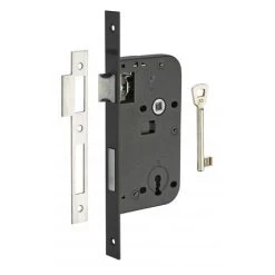 Coffre acier embouti. TĂŞtière acier. Demi-tour rĂ©versible sans dĂ©montage du coffre. PĂŞne alliage zinguĂ©. Gâche plate acier. MĂ©canisme Ă 2 tours. CarrĂ© 7mm, entr’axe 70 mm. 1 clĂ©. 10 variures.