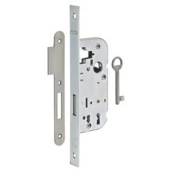 Coffre acier embouti. Têtière acier. Pêne acier. Gâche plate acier. Mécanisme à 1 tour. 1 clé. 6 variures.