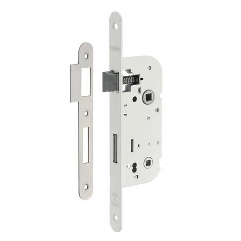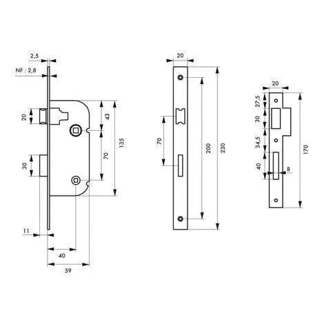 Coffre acier embouti. TĂŞtière acier. Demi-tour alliage rĂ©versible sans dĂ©montage du coffre. PĂŞne acier. Gâche plate acier. CarrĂ© 7mm, entr’axe 70 mm.- Dimension : 59x135mm