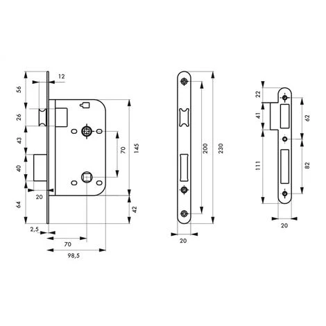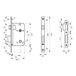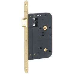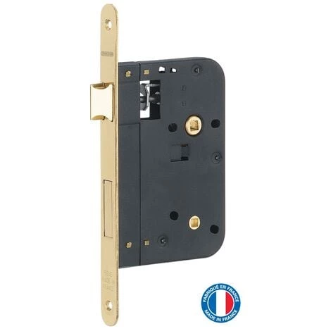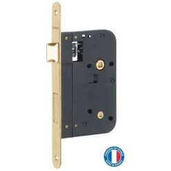 Coffre acier embouti. Têtière laiton. 1/2 tour laiton réversible sans démontage du coffre. Pêne laiton Carré 7mm. Gâche plate selon finition.
