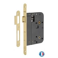 Coffre acier embouti. TĂŞtière laiton. 1/2 tour laiton rĂ©versible sans dĂ©montage du coffre. PĂŞne laiton. Rappel du 1/2 tour par la clĂ©. CarrĂ© 7mm, entr’axe 70 mm. Gâche plate selon finition.- Dimension : 108.5x145mm