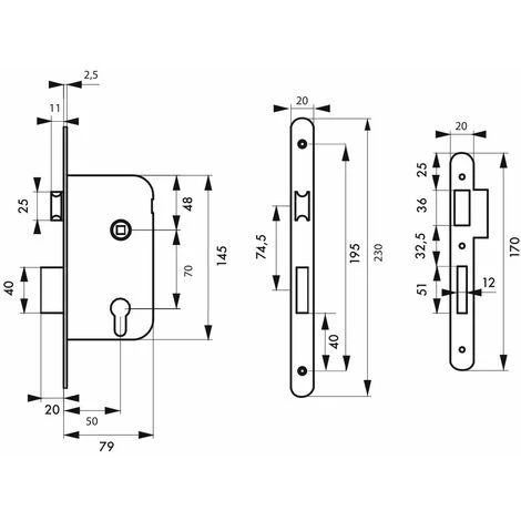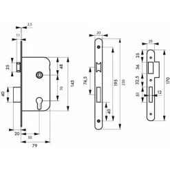 Coffre acier embouti. TĂŞtière acier. Demi-tour alliage zinguĂ©. rĂ©versible sans dĂ©montage du coffre. PĂŞne alliage zinguĂ©. Gâche plate acier. MĂ©canisme Ă 2 tours. Rappel du 1/2 tour par la clĂ©. CarrĂ© 7mm, entr’axe 70 mm. Cylindre profilĂ© laiton 30 x 30 mm. 3 clĂ©s en acier nickelĂ©.- Dimension : 79x145mm