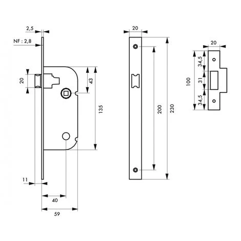 Coffre acier embouti. TĂŞtière acier. Demi-tour alliage rĂ©versible sans dĂ©montage du coffre. Gâche plate acier. CarrĂ© 7mm.Ce boitier de serrure Ă encaster Ă bec de cane en acier est conçu pour fermer efficacement vos portes intĂ©rieures. Cette serrure est destinĂ©e Ă ĂŞtre complĂ©tĂ©e avec le cylindre de votre choix, vous permettant de choisir votre niveau de sĂ©curitĂ©. DotĂ©e d’un demi-tour rĂ©versible sans dĂ©montage, cette serrure s’installe facilement et offre un verrouillage efficace de votre porte. Ce boitier de serrure Ă encastrer de la marque Thirard est disponible avec tĂŞtière Ă bouts arrondis ou carrĂ©s, blanche ou zinguĂ©e.- Dimension : 59x135mm