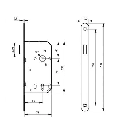 Coffre acier embouti. Têtière acier bouts ronds. Système magnétique à pêne rétractable. Gâche plate acier. Carré 7mm, entr’axe 70 mm.