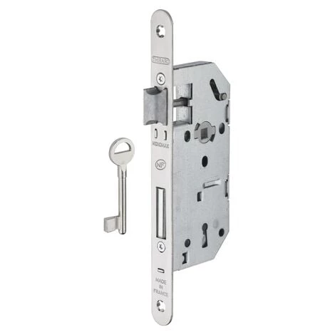 Coffre acier embouti. TĂŞtière acier bouts ronds. Demi-tour bipente alliage rĂ©versible sans dĂ©montage du coffre. PĂŞne acier galvanisĂ©. Gâche plate acier zinguĂ©. MĂ©canisme Ă 2 tours. CarrĂ© 7mm, entr’axe 70 mm. 1 clĂ©. 4 Variures.La serrure Ă pĂŞne dormant Ă encaster Monomax est conçue pour verrouiller efficacement vos portes d’intĂ©rieur. Une gâche plate en acier et une clĂ© sont fournies avec cette serrure. DotĂ©e d’un demi-tour rĂ©versible sans dĂ©montage et d’un mĂ©canisme Ă deux tours, cette serrure certifiĂ©e NF est durable, sĂ©curisĂ© et rĂ©sistante. Elle s’installe facilement pour offrir un verrouillage efficace de votre porte. Cette serrure de porte Ă condamnation Thirard est disponible en diffĂ©rentes versions : Ă tĂŞtière Ă bouts carrĂ©s ou arrondis, en finition noir granitĂ©, zinguĂ©e, inox ou laitonnĂ©e.