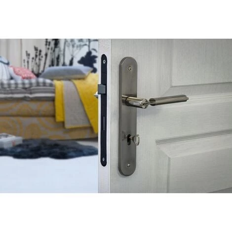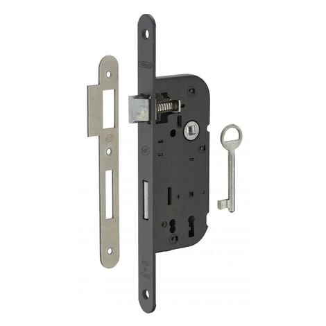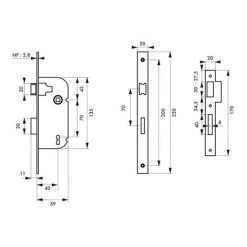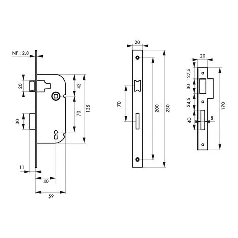 Coffre acier embouti. TĂŞtière acier. Demi-tour alliage rĂ©versible sans dĂ©montage du coffre. PĂŞne acier. Gâche plate acier. MĂ©canisme Ă 1 tour. CarrĂ© 7mm, entr’axe 70 mm. 1 clĂ© – 6 variures.- Dimension : 59x135mm