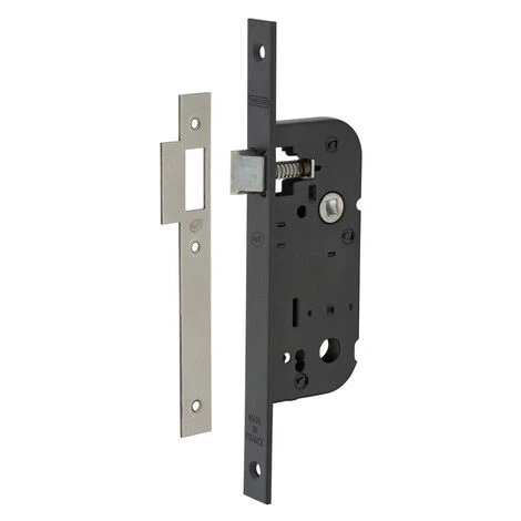 Coffre acier embouti. Têtière acier. Demi-tour alliage réversible sans démontage du coffre. Gâche plate acier. Carré 7mm.