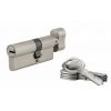Pommeau extérieur en acier embouti avec cylindre de sûreté à goupilles. Pommeau intérieur en acier embouti avec double entrée de clés. Pêne 1/2 tour réversible avec dispositif de sécurité et têtière rectangulaire. Gâche plate. Axe réglable 60/70mm. 3 clés en acier nickelé.