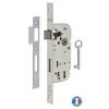 Coffre et gâche acier cambré. Pêne et demi-tour acier. Canon acier longueur 35 mm. Mécanisme à 1 tour. Pêne 1/2 tour réversible pour porte ouvrant à l’extérieur. Carré 7mm. 2 clés nickelées. 6 variures. Entrée de clé et de fouillot acier- Dimension : 70x110mm