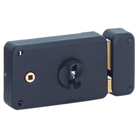 Coffre et gâche en acier embouti. Pênes en acier rallongés de 5 mm. Mécanisme à deux tours. Rappel du demi-tour à la clé. Entrée de cylindre et fouillot laiton. Finition : zingué bichromaté époxy noir granité.