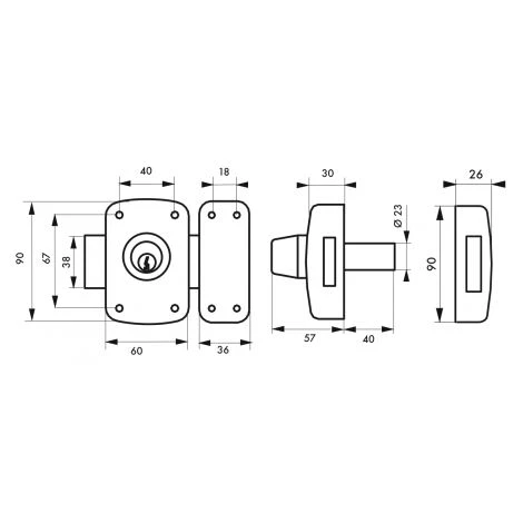Coffre acier embouti. Gâche acier embouti. Pêne en acier chromé. Cylindre double laiton à 5 goupilles. Entrée laiton. 3 clés en acier nickelé.